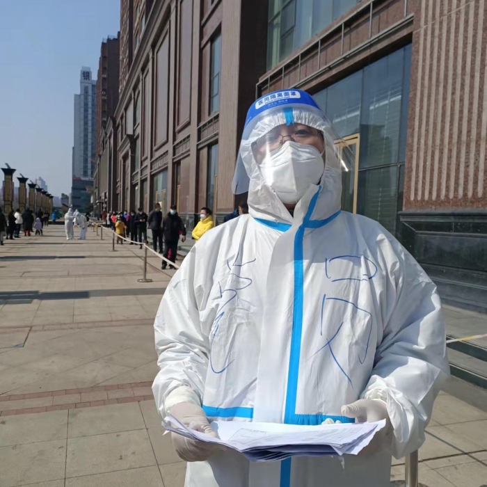 在疫情防控的关键阶段,辛士界第一时间响应党员干部到社区进行疫情防控服务的倡议,到公平社区报名参加志愿者,坚守一线,成为抗疫攻坚战中不可或缺的中坚力量。他在统一指导下穿戴好防护装备,化身为“大白”,很快适应了角色。面对严峻的疫情形势,他保持积极乐观的心态,用幽默的话语耐心回复居民疑问,消除群众忧虑心理,稳定居民情绪,切实解决居民实际困难。每天的核酸检测队伍旁都有他的身影,提示居民提前打开手机的行程码和吉祥码,耐心帮助老人和小孩进行核酸检测登记,督促居民戴好口罩并保持2米以上安全距离,劝导居民不扎堆、不聚集、核酸结束后立即返回家中。