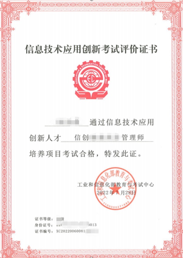 经考试所有科目成绩合格者,获得由工业和信息化部教育与考试中心颁发的信息技术应用创新人才评价考试证书。样式如下: